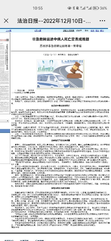 患者出院或转院时,确系行动不便或生命体征不稳定时,又不能占用急救资源,所以非急救转运成为救治服务的补充形式。全新模式下的法律纠纷不仅成为人民法院受理的新类型案件,而且也是司法鉴定的盲区。近日,苏州市相城区人民法院审结了苏州地区涉非急救转运服务第一案。本案人民法院委托苏州同济司法鉴定所进行鉴定。因不属于严格意义的医疗损害,但又涉及急救专科,同济组织相关学科的医学专家和法医学专家召开鉴定会,讨论、论证,出具的司法鉴定意见得到双方当事人的认可,人民法院予以采信。2022年12月6日和10日《江苏法治报》与《法治日报》分别进行了报道。